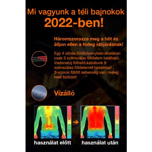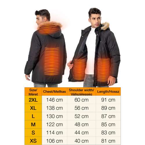 - Fűtés: 9 szénszálas fűtőelem 3 fűtési fokozattal (magas, közepes, alacsony), melegíti a nyakat, hátat, hasat és derekat. Gyors felmelegedés 7,4 V akkumulátorral, akár 8-10 órányi meleg. USB port mobil eszközök töltéséhez.