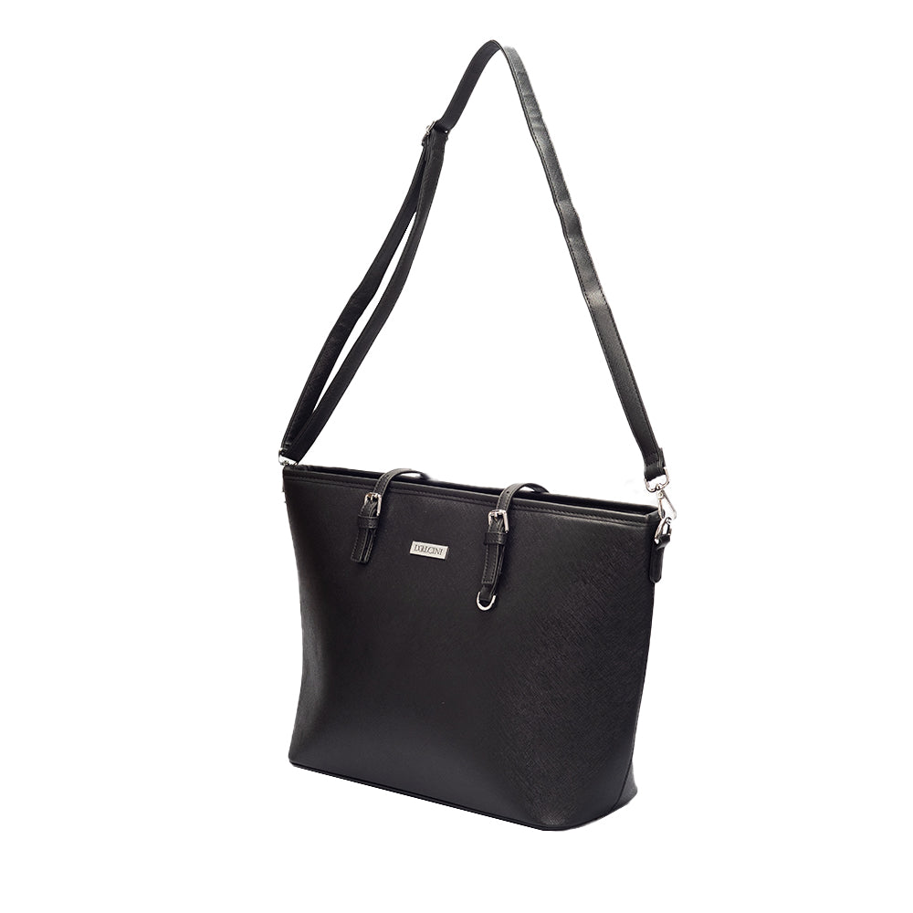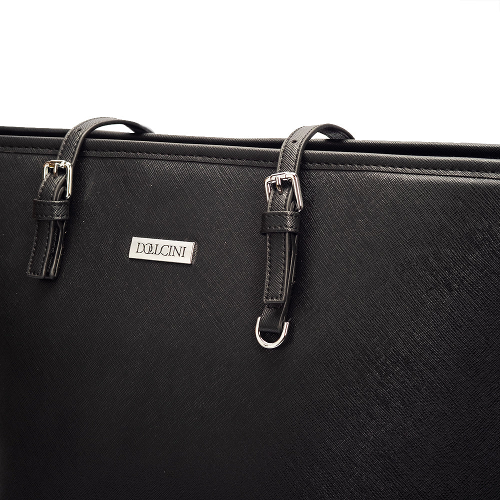 A Dollcini klasszikus fekete nagyméretű női kézitáska a letisztult elegancia és a praktikusság tökéletes kombinációja. Prémium műbőrből készült, amely vízlepergető és kopásálló, belsejében pedig jól rendszerezhető rekeszek segítik a mindennapi használatot. Tágas kialakítása lehetővé teszi laptop, dokumentumok, pénztárca és más kiegészítők kényelmes tárolását. Elegáns részletei és minimalista stílusa miatt irodai, hétköznapi és utazási szettekhez is ideális választás.