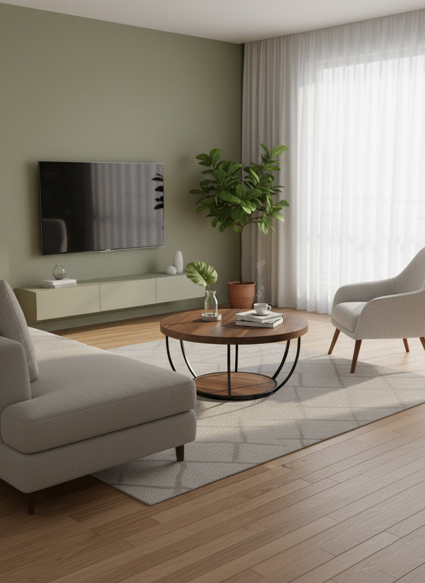 Dollcini Otthon Kerek Fa Dohányzóasztal Ipari Stílusban – Alsó Polccal
