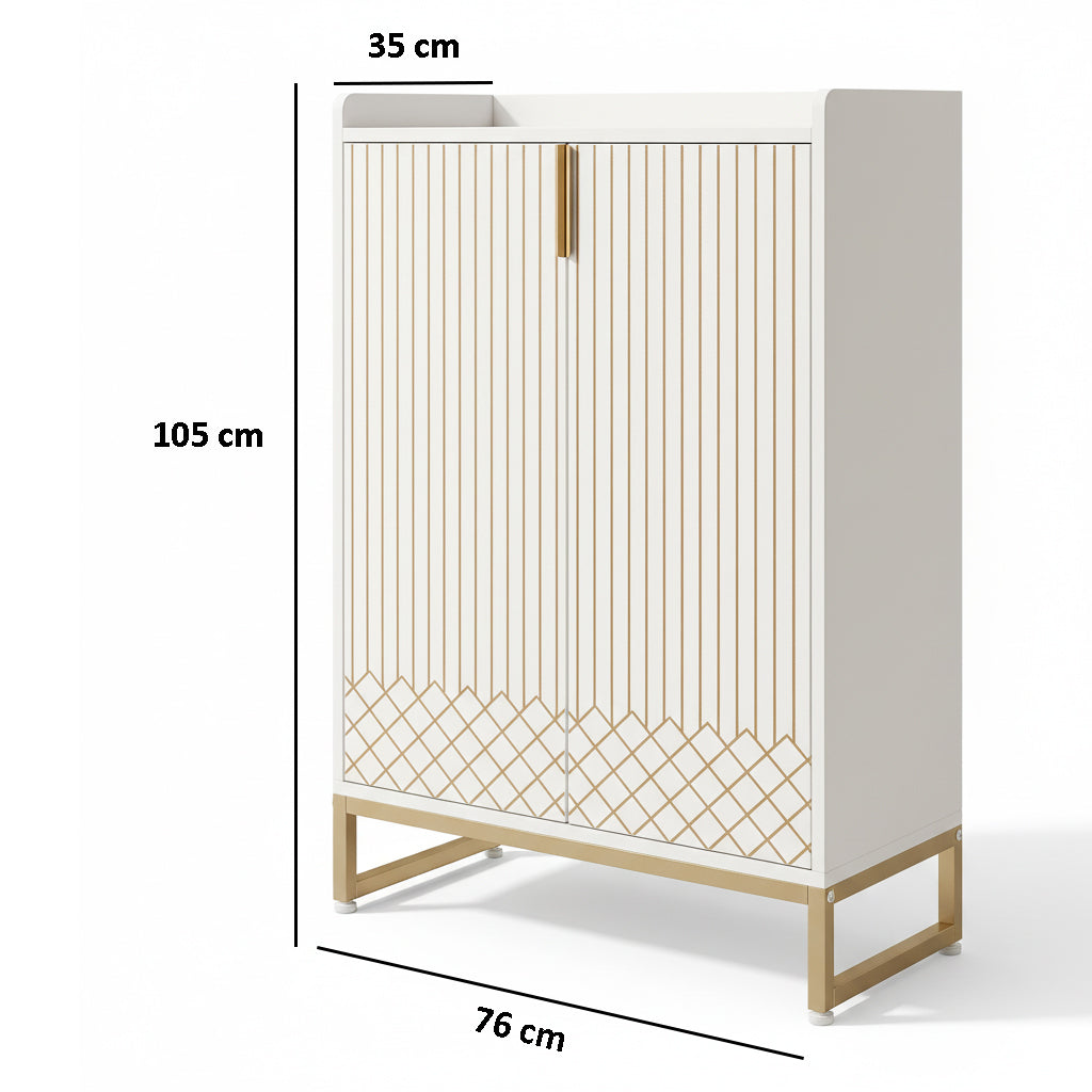 - Lenyűgöző Dizájn: A kétszárnyú ajtón végigfutó, precízen kidolgozott arany mintázat egyedi és művészi karaktert kölcsönöz a bútornak.