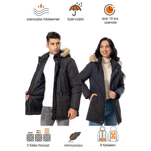 - Fűtés: 9 szénszálas fűtőelem 3 fűtési fokozattal (magas, közepes, alacsony), melegíti a nyakat, hátat, hasat és derekat. Gyors felmelegedés 7,4 V akkumulátorral, akár 8-10 órányi meleg. USB port mobil eszközök töltéséhez.