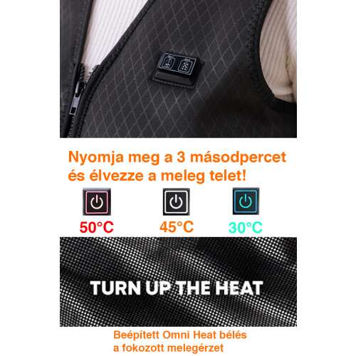 - 9 Fűtőelem: 9 szénszálas fűtőelem elosztva a nyakon, vállakon, elülső részen és a teljes háton a teljes melegség érdekében.