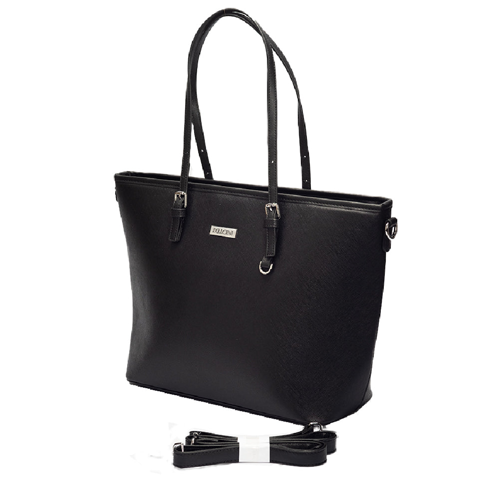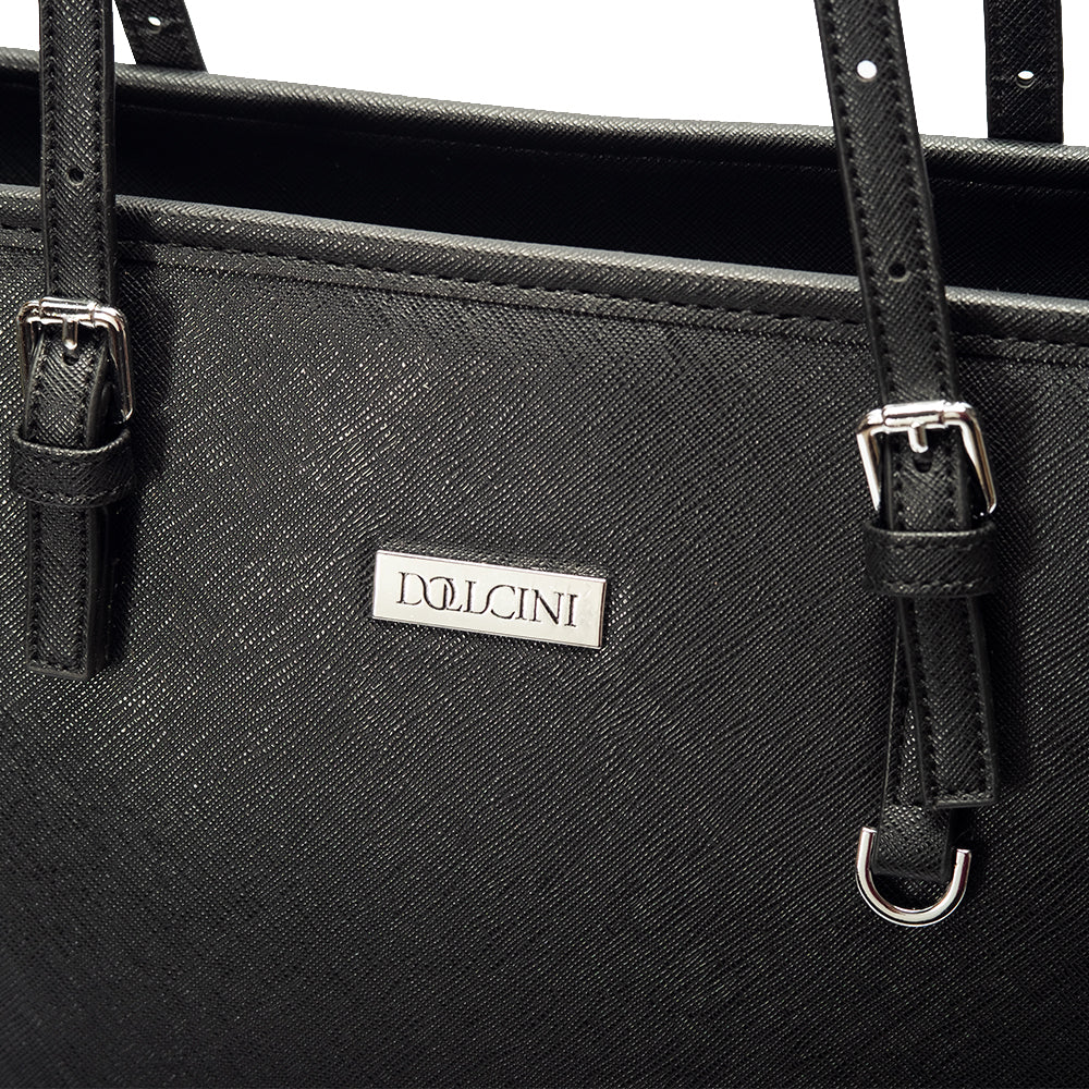 A Dollcini klasszikus fekete nagyméretű női kézitáska a letisztult elegancia és a praktikusság tökéletes kombinációja. Prémium műbőrből készült, amely vízlepergető és kopásálló, belsejében pedig jól rendszerezhető rekeszek segítik a mindennapi használatot. Tágas kialakítása lehetővé teszi laptop, dokumentumok, pénztárca és más kiegészítők kényelmes tárolását. Elegáns részletei és minimalista stílusa miatt irodai, hétköznapi és utazási szettekhez is ideális választás.