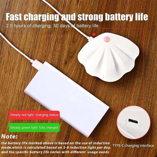 Ez a kagyló alakú éjszakai lámpa tökéletes választás otthona bármely helyiségébe, legyen szó hálószobáról, folyosóról vagy gyerekszobáról. Elegáns megjelenése és intelligens működése praktikus és dekoratív világítási megoldást nyújt.