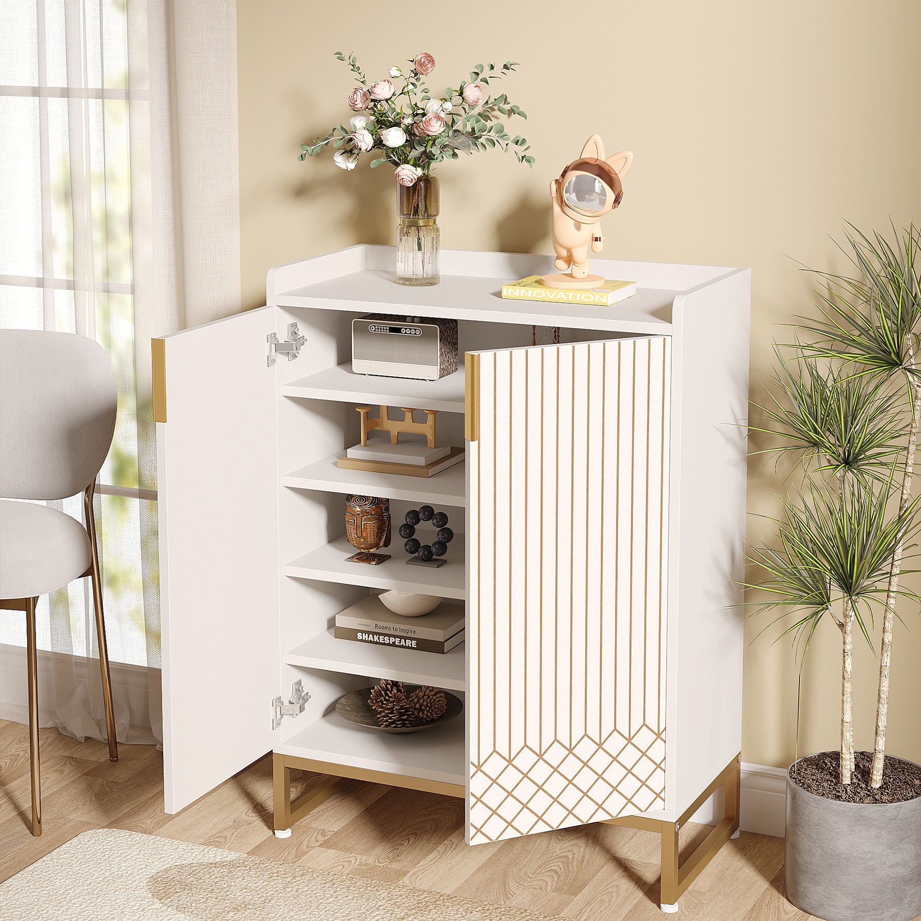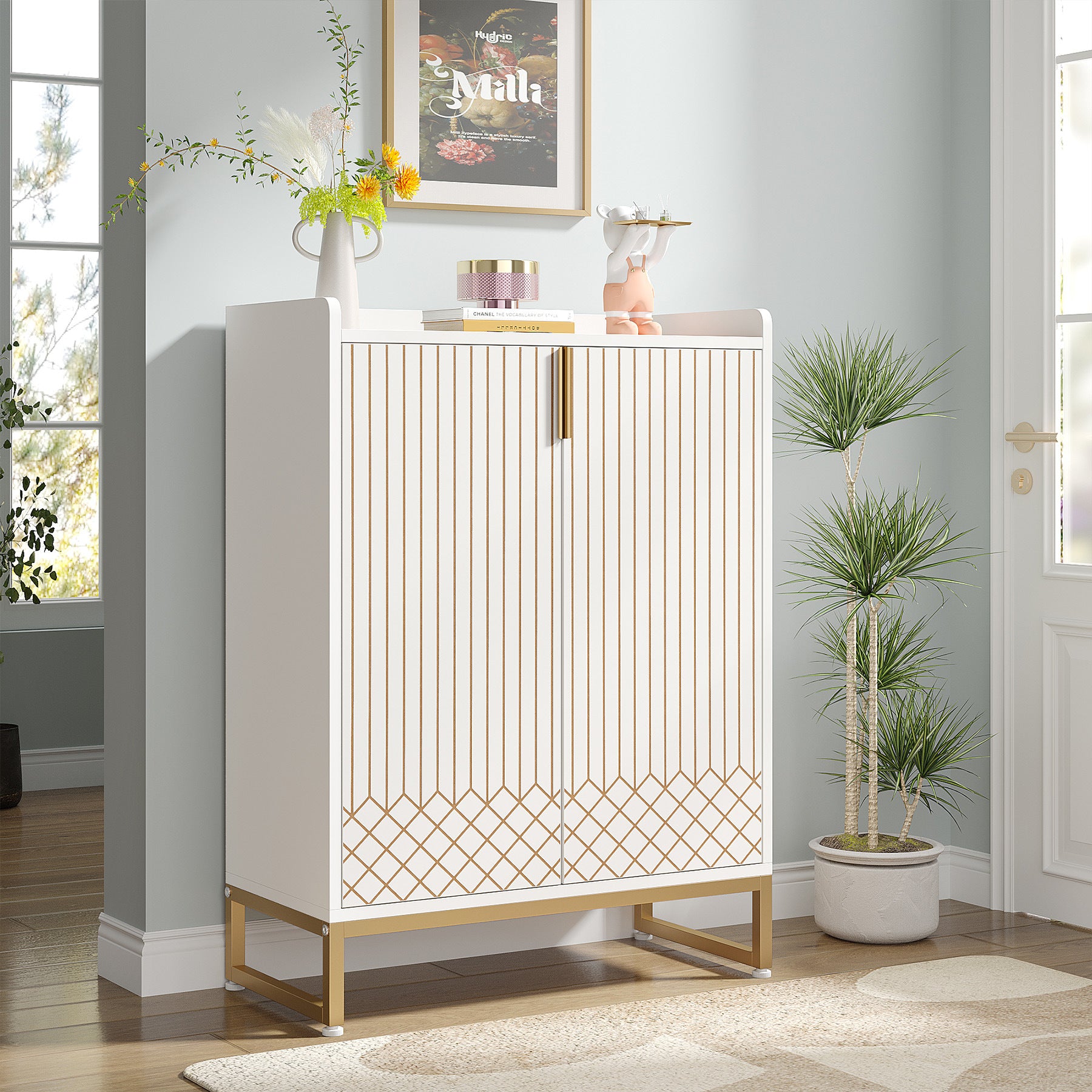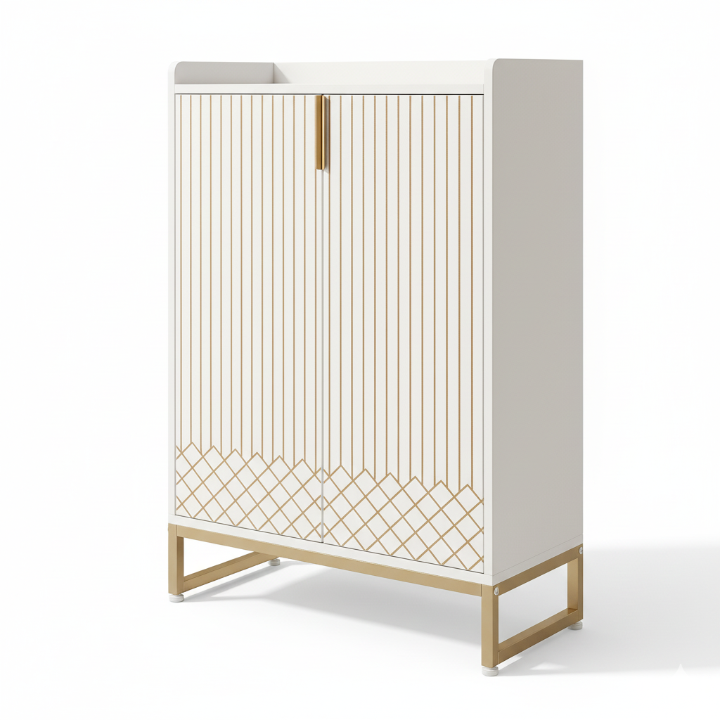 - Lenyűgöző Dizájn: A kétszárnyú ajtón végigfutó, precízen kidolgozott arany mintázat egyedi és művészi karaktert kölcsönöz a bútornak.