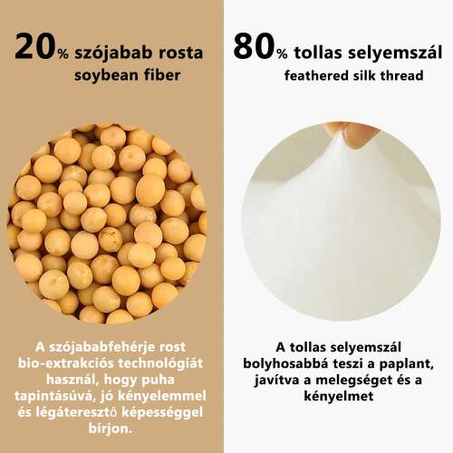 Élvezze a természet és az innováció tökéletes harmóniáját a Dollcini szójababrostos paplannal, amely 20% szójafehérjéből készült rostot és 80% tollselyemszálat tartalmaz – puha, meleg, lélegző és bőrbarát minden érintésében.